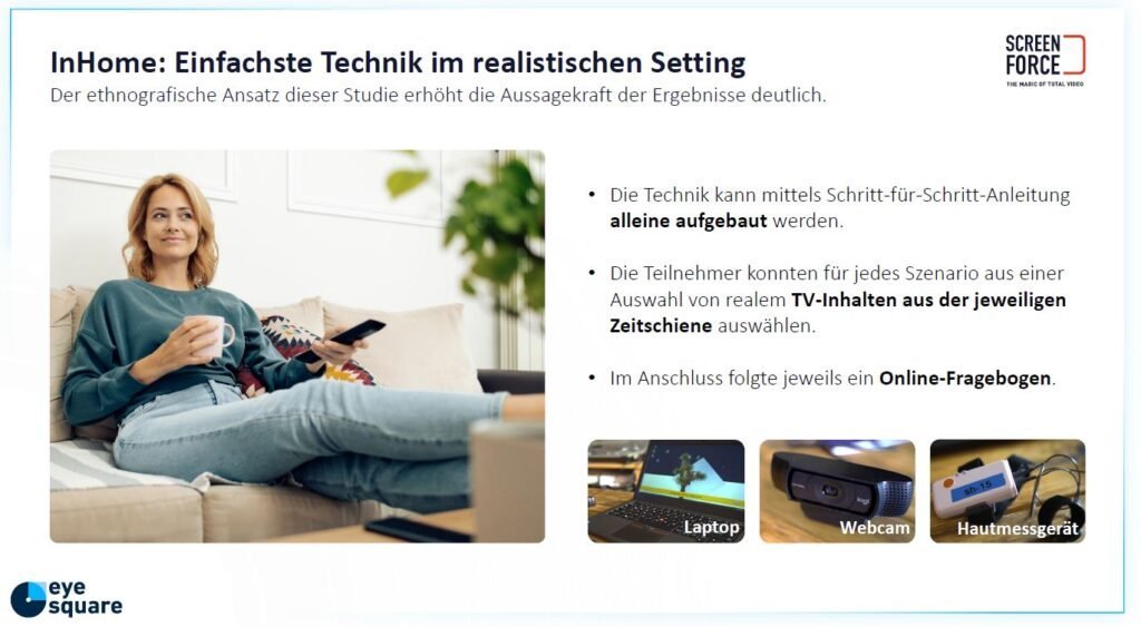 In het nieuwe onderzoek wordt door onderzoeksbureau Eye Square met behulp van een webcam het kijkgedrag van consumenten in de eigen huiskamer vastgelegd en naderhand geanalyseerd. Met behulp van een huidgeleidingsmeter wordt tijdens het TV-kijken de emotionele respons op de TV-content en de TV-commercials gemeten. De proefpersonen kunnen zelf kiezen gedurende welk dagdeel ze naar welke soort programma’s willen kijken. Na afloop van het TV-kijken wordt er bij alle proefpersonen een online vragenlijst afgenomen waarmee effectvariabelen zoals reclameherinnering, reclamewaardering, boodschap overdracht en koopintentie konden worden gemeten. In het onderzoek zijn vier dagdelen onderscheidden, elk met hun eigen kijksituatie.
