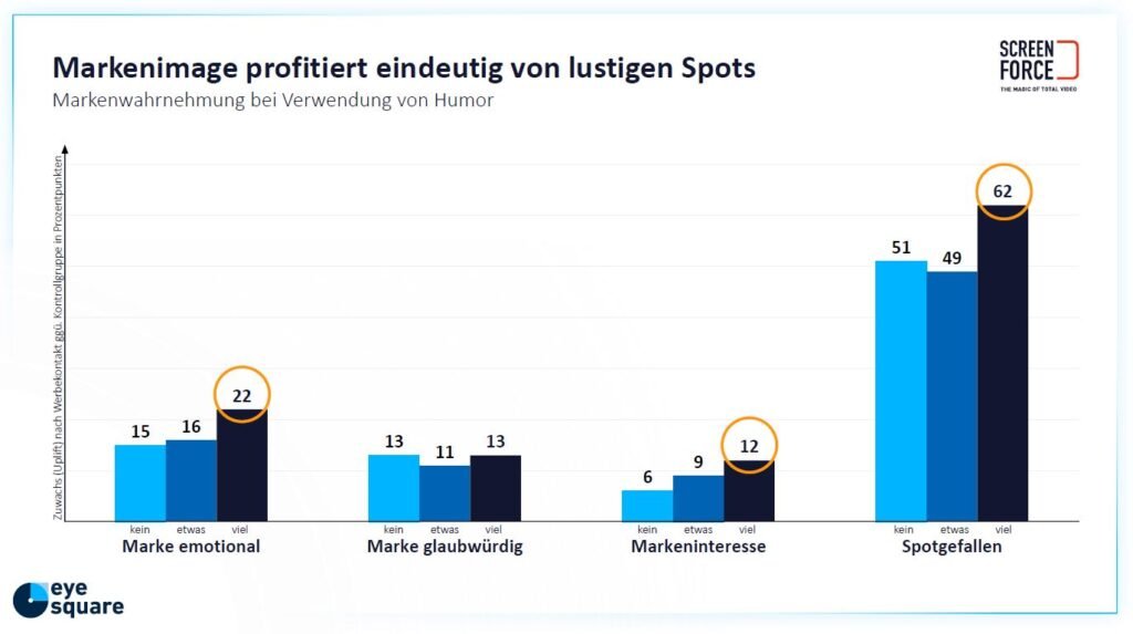 In de onderstaande figuur wordt achtereenvolgens in de kolommen weergegeven wat het effect is van het gebruik van geen, een beetje of veel (kein, etwas, viel) humor op, in de vier uitsplitsingen achtereenvolgens, of dat men het merk emotioneel vindt, geloofwaardig vindt, of dat men interesse heeft in het merk en als laatste of dat men de TV-commercial waardeert (Spotgefallen). De TV-commercial wordt 62% beter gewaardeerd bij gebruik van humor door de personen die de commercials hebben gezien dan door de personen die hem niet hebben gezien (= de controlegroep). De controlegroep ziet de desbetreffende commercial pas in de vragenlijst na afloop en wordt dan gevraagd deze te waarderen. Als er geen humor in zit is dit 51% hoger dan de controlegroep, een TV-commercial zonder humor is dus ook effectief. Voor merkemotie en merkinteresse is er ook een positief effect maar dat is minder groot. Het blijkt uit extra analyses dat de inzet van humor niet ten koste gaat van de geloofwaardigheid.