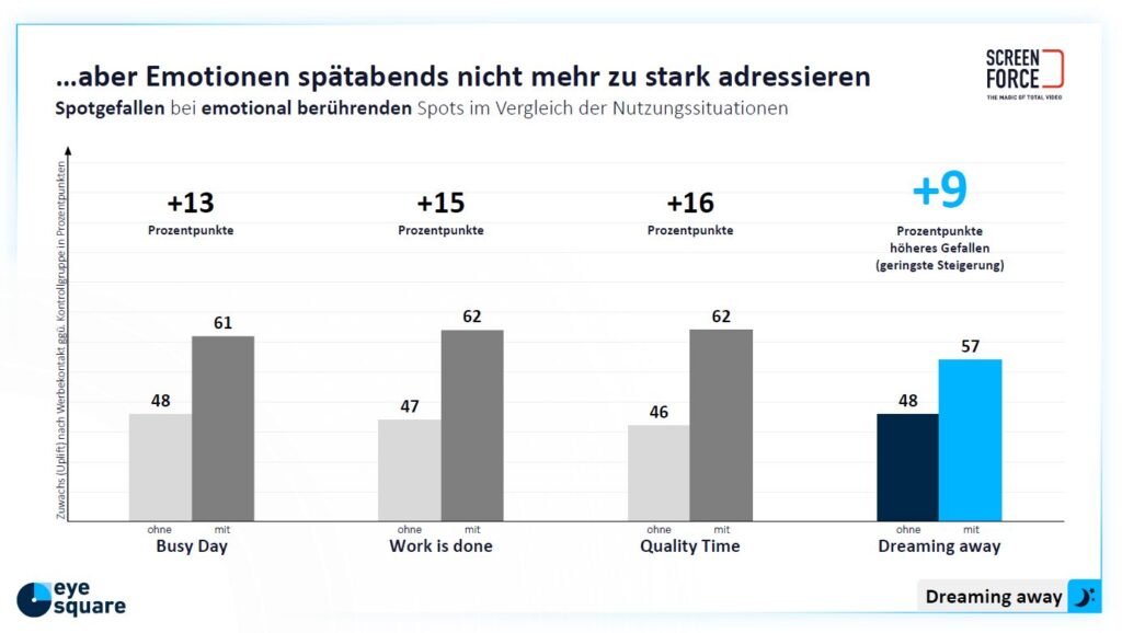 Een feel good verhaal zonder verkoopargumenten werkt het beste. Langere spots van 30 seconden of langer met esthetische beelden, sympathieke hoofdpersonen die met elkaar interacteren in een artistieke/creatieve wereld, zijn het meest effectief. Te korte spots met een saaie of alledaagse setting, weinig esthetisch, te emotioneel (opwinding vermijden), zonder verdere informatie of met te veel nadruk op het merk, zijn minder effectief. De reclame moet niet te luid of te heftig zijn om de kijker in zijn dromerige stemming te laten. In de onderstaande grafiek wordt het effect weergegeven van TV-commercials die emotie gebruiken. Dat werkt later op de avond minder goed, maar nog wel gemiddeld positief, dan tijdens de andere dagdelen omdat sommige TV-commercials te heftige emoties inzetten, die later op de avond de dromerige stemming van de kijkers kunnen verstoren.