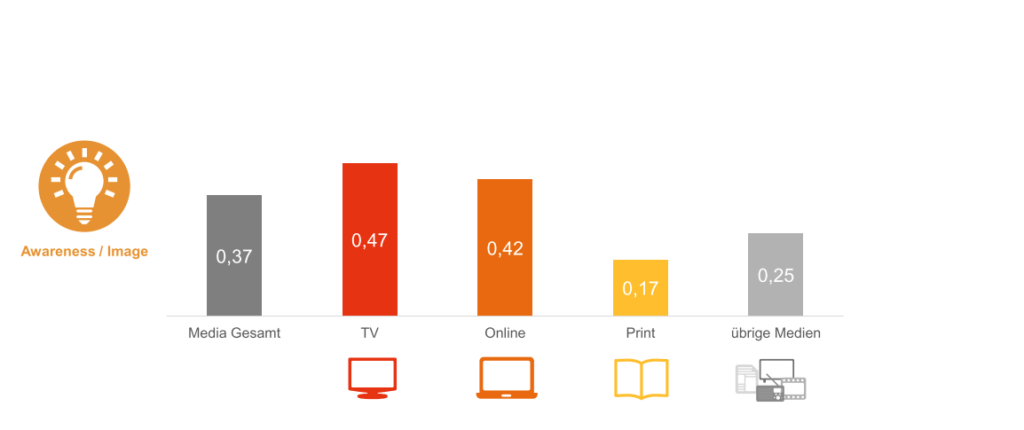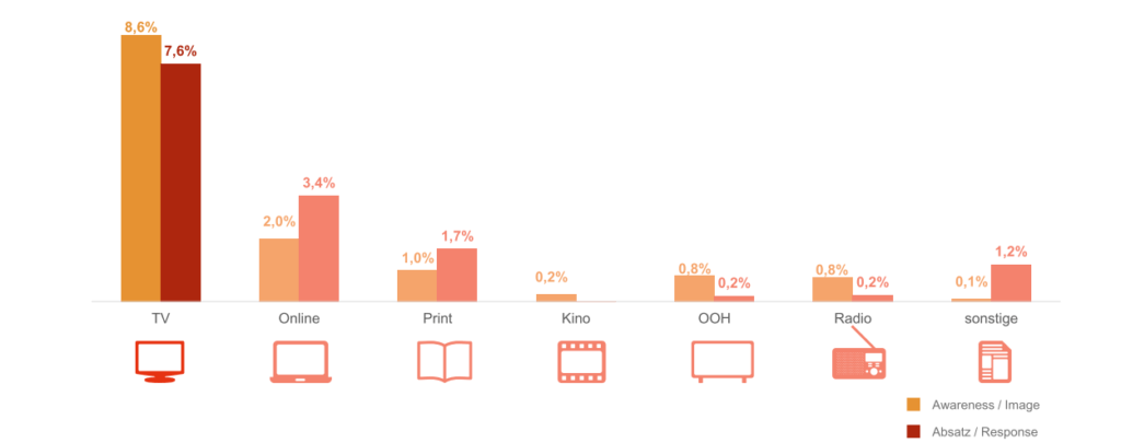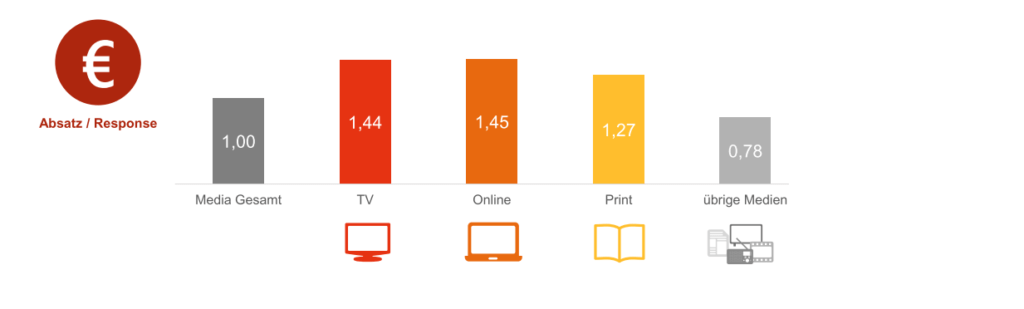 De effectiviteit van het ingezette mediabudget op de verkoop verschilt sterk per branche en per reclamedoelstelling. Volgens onderzoek door Dentsu Aegis Duitsland is het effect het grootst voor responsecampagnes voor de branches finance, pharma en e-commerce. Opvallend is dat de gemiddelde bijdrage van de mediabestedingen aan de verkoop voor de afgelopen vijf jaar groter is dan voor de jaren daarvoor. Voor awareness campagnes vormt TV een essentieel onderdeel van het mediaplan. Voor responsecampagnes is de efficiëntie van TV, online en print vergelijkbaar.