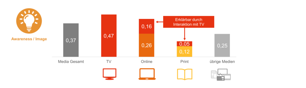 Uit de analyses van Dentsu Aegis blijkt dat online en print bij awareness campagnes profiteren van de inzet van TV. Door voor een campagne 1 miljoen extra bruto TV-budget in te zetten stijgt zowel de verkoop met 0,47% vanwege het extra TV effect maar ook het effect van online stijgt met een extra 0,16% en van print met 0,05%. Dat betekent dat de bijdrage van TV aan de verkopen voor awareness campagnes dus opgeteld 0,47% + 0,21% = 0,68% is.