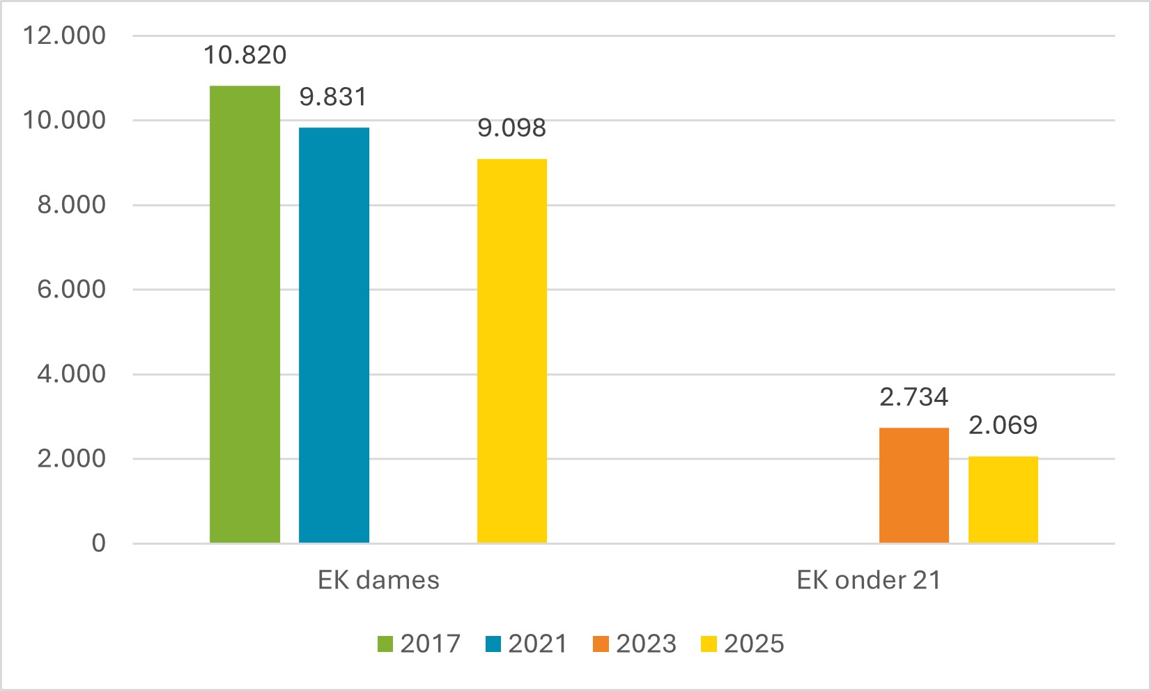 Het is nog maar drie jaar geleden dat het vorige Europees Kampioenschap voetbal voor dames werd gehouden. De editie van 2021 was namelijk een jaartje doorgeschoven vanwege de Corona-pandemie. 2017 was het jaar van de grote ommezwaai in het damesvoetbal. In dat jaar was Nederland gastland en wist het de winst naar zich toe te trekken. De finale werd toen door 4.1 miljoen mensen bekeken en haalde 84,9% zenderaandeel. In dat jaar koos de NOS er nog voor in de poule-fase alleen de wedstrijden van de Nederlandse dames uit te zenden. Eurosport zond toen wel ook de andere poule-wedstrijden uit. Over de verschillende zenders bereikten alle uitzendingen bij elkaar toen bijna 11 miljoen kijkers van 6 jaar en ouder. Net als in 2021 heeft de NOS dit jaar alle wedstrijden uitgezonden. Er was dus een hoop meer te kijken. Alle uitzending bij elkaar waren deze zomer goed voor een bereik van 9,1 miljoen kijkers in de doelgroep 6 jaar en ouder. Drie jaar geleden was dat nog 9,8 miljoen kijkers. Dat Nederland toen met de kwartfinale net wat verder is gekomen dan dit jaar heeft hier ook invloed op gehad.