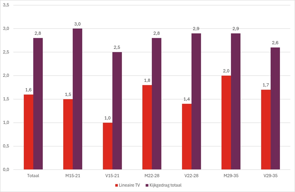 De totale kijktijd van jongeren naar content op de TV is licht gedaald van 3,2 naar 2,8 uur per dag, maar lineaire TV blijft goed voor meer dan de helft van die tijd met 1,6 uur per dag. Hierbij zijn wel verschillen zichtbaar tussen leeftijdsgroepen en mannen en vrouwen, zoals in onderstaande grafiek te zien is. Vrouwen tussen 15 en 21 jaar kijken het minst naar lineaire TV. Mannen tussen de 29 en 35 jaar het meest.