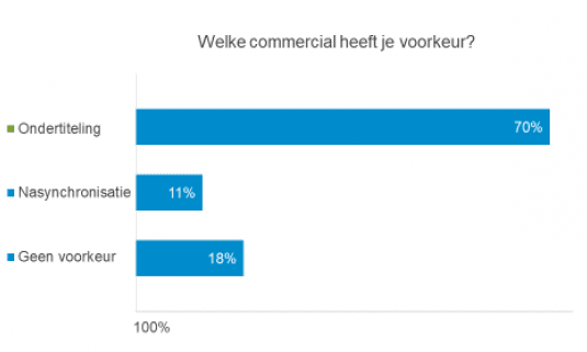 Slechts 11% gaf de voorkeur aan de nagesynchroniseerde spot. 70% gaf de voorkeur aan de ondertitelde spot en de rest had geen voorkeur.