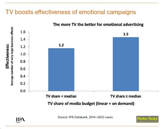 Uit onderzoeken blijkt dat TV bij uitstek een medium is dat in staat is om emoties op te wekken. Daarmee vormt TV de snelweg naar effectiviteit. Volgens de IPA-databank bevat de helft (49%) van alle TV-campagnes emotionele argumenten en veel kleiner deel (38%) rationele argumenten. In de onderstaande figuur staat het gemiddeld aantal grote positieve bedrijfsresultaten weergegeven voor een gemiddelde TV inzet binnen een campagne versus een méér dan gemiddelde TV inzet (lineair en on demand). De campagnes met een meer dan gemiddelde TV-inzet waren significant effectiever dan campagnes met een gemiddelde TV-inzet. Uiteraard pleit niemand ervoor om voor 100% TV in te zetten, andere mediumtypen spelen een belangrijke rol bij de overige stappen binnen de marketingfunnel, zoals de uiteindelijke aankoop. De meest effectieve IPA-databank campagnes besteden 45% van hun mediabudget aan TV.