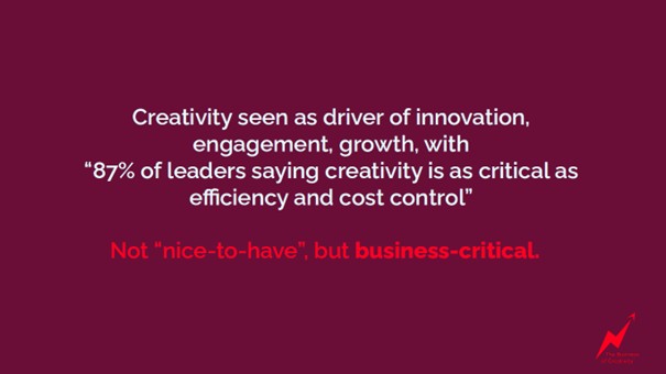 Eerste spreker tijdens het webinar was reclamelegende Sir John Hegarty, medeoprichter van Bartle Bogle Hegarty (BBH). Hij meent dat, in deze tijd van disruptie en de opkomst van AI, creativiteit juist fundamenteel is voor zakelijk succes. Uit onderzoek van Opinium onder 500 zakelijk leiders van over de hele wereld blijkt dat inmiddels 87% van hen aangeeft dat creativiteit net zo belangrijk is als efficiëntie en kostenbeheersing. Creativiteit is dus duidelijk geen ‘nice to have’.