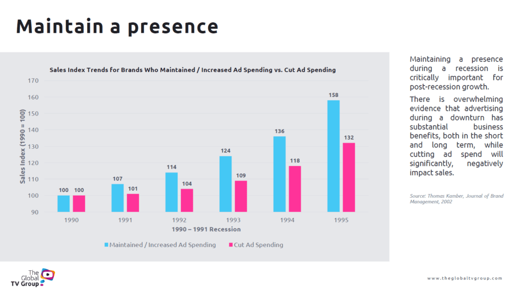De learnings die Mark Ritson heeft verzameld maken allemaal duidelijk dat het als merk belangrijk is om te blijven investeren in communicatiecampagnes tijdens een recessie. De onderzoeksresultaten maken duidelijk dat merken die blijven investeren qua verkopen veel beter uit de recessie komen dan merken die hebben bezuinigd tijdens de recessie. Dat blijkt bijvoorbeeld uit onderstaande analyse van de 1990-1991 Golfoorlog recessie. Ritson citeert ook een recent artikel in de Harvard Business Review dat als conclusie heeft dat bezuinigen op ‘vet binnen de interne organisatie’ wel zinvol kan zijn maar dat het stoppen met investeren in marketing negatief uitpakt.