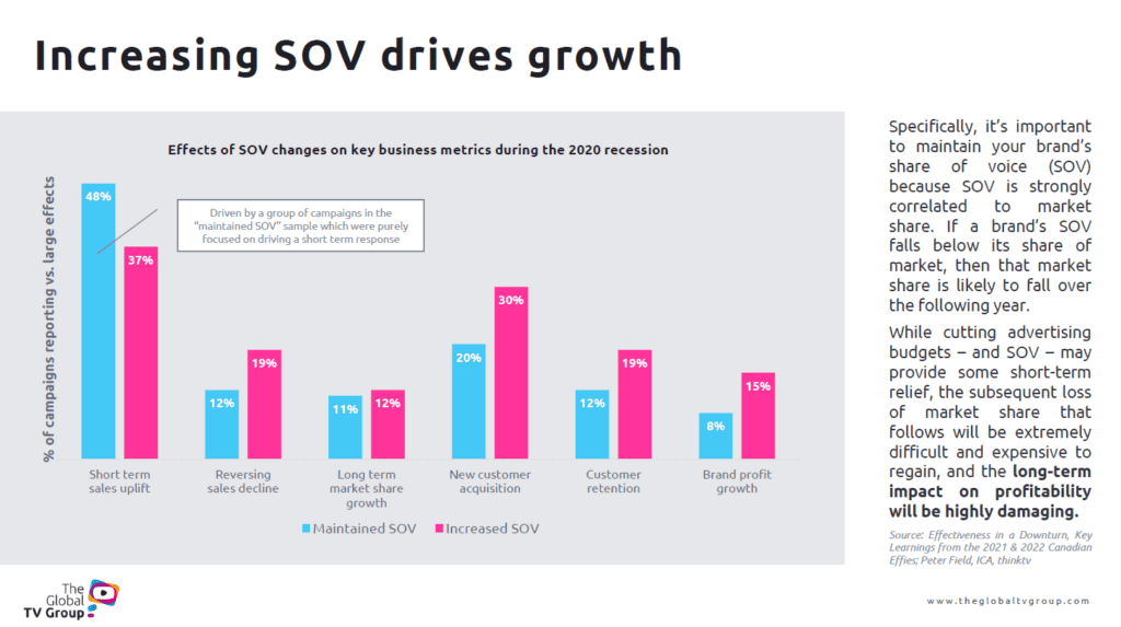 Als je tijdens een recessie je aandeel binnen de reclamebesteding van jouw branche (Share of Voice – SOV) vasthoudt dan zie je dat je dit gelijk terugverdient in je korte termijn verkopen. Als de SOV zelfs vergroot, wat vanzelf gebeurt als concurrenten wel stoppen met reclame maken, dan zijn de positieve effecten nog veel groter. Dat blijkt uit onderstaande analyse. Je herstelt de daling in verkopen, je marktaandeel groeit, je trekt nieuwe klanten aan en je houdt bestaande klanten beter vast en je merk maakt meer winst.