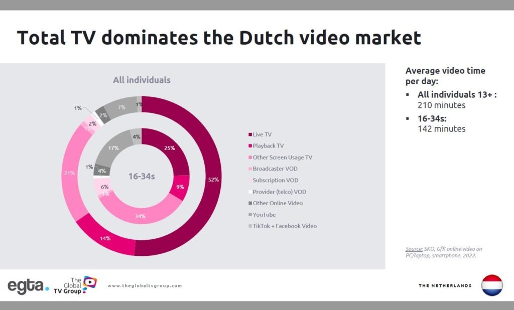 Het deck geeft inzicht in de sterke positie die ‘Total TV’ wereldwijd inneemt. Onder Total TV verstaan we het kijken naar alle vormen van broadcaster TV content. Dat kan live of uitgesteld TV kijken zijn via het TV-scherm of ook on demand (BVOD) of online TV-content kijken via andere online devices. In de onderstaande figuur staan de cijfers voor geheel 2022 voor de Nederlandse videomarkt. Het zijn de gecombineerde cijfers van het SKO Kijkonderzoek en het GfK GXL/DAM online bereikonderzoek. Volwassenen van 13 jaar en ouder kijken in Nederland gemiddeld 210 minuten per dag naar alle verschillende soorten van videocontent, inclusief social media. Van deze kijktijd is ruim tweederde (67%) kijktijd naar Total TV content.