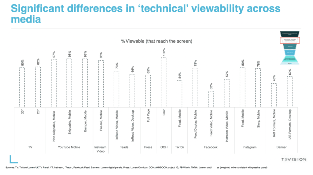 En hier wordt het crossmedia perspectief interessant omdat er een interessante discrepantie is. Voor de meeste media zit er een daling tussen waar mensen naar kijken en wat ‘technisch’ zichtbaar is. Maar voor sommige media – zoals de social media platforms – wordt er meer bekeken dan er zichtbaar is. Dat komt omdat wanneer deze reclames de viewport van het mobiele device bereiken, ze kort wat aandacht kunnen krijgen van de kijker ondanks dat ze niet de volledige 2 seconden in beeld zijn om te voldoen aan de technische MRC-norm. De viewport is het gedeelte van de interface van een webbrowser waarbinnen de inhoud van een website wordt weergegeven.