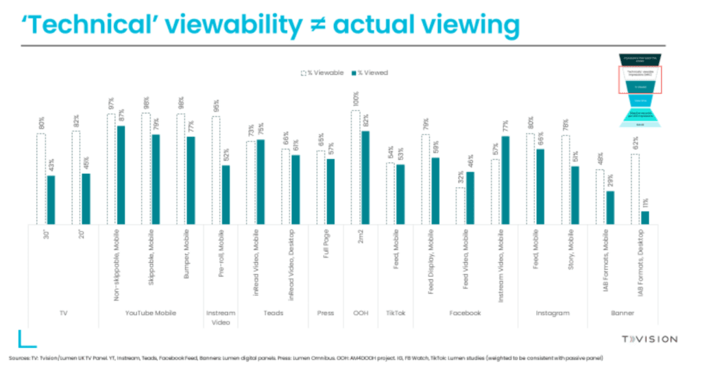 Voor een deel wordt deze zichtbaarheid al meegewogen in de resultaten van het Britse Kijkonderzoek BARB: De panelleden wordt gevraagd om zichzelf ‘aan’ en ‘af’ te melden wanneer ze de kamer binnenkomen en weer verlaten. Maar dat verhelpt niet het probleem dat mensen aanwezig zijn in de kamer maar ook even in slaap kunnen vallen. Het is zeer interessant om deze TV-data te vergelijken met de zichtbaarheid data van andere media (niet uitgeleverde impressies en online reclames die niet op het scherm komen). Weliswaar zijn niet alle TV-reclames zichtbaar maar TV presteert op dit punt veel beter dan andere media.